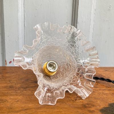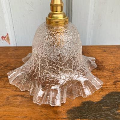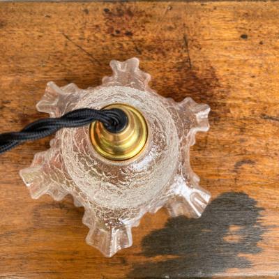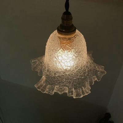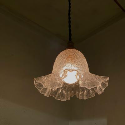ガラスの凹凸を生かしてキラキラきらめくガラスシェードが入荷しました。フランス製、推定1940年代。【41-206】飴細工のような独特のガラスが光を乱反射して見たことのないような空間を演出してくれます。撮影には白熱球(電球色)の25Wを使用しています。口金E17サイズのLED電球も使用できます。電球の明るさによって見え方がずいぶんと変わってきますので、ご使用の場所に応じた電球をご利用ください。コードの色は「ホワイト・ブラウン・ブラック」の3色からお好きな色をお選びください。長さは一般的な約50㎝(コードのみの長さ)でお造りしております。何もご指定がない場合は撮影と同じ「ブラック・約50㎝」にてお届けします。長さの延長は別途有料にて作成できますのでお申し付けください。福岡市南区の店舗にてお渡しもできますのでお気軽にどうぞ!