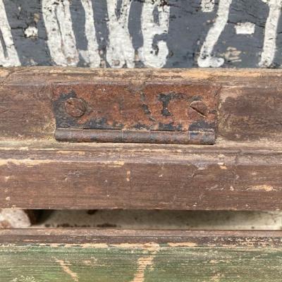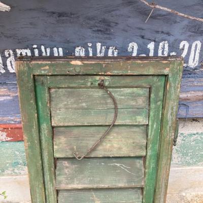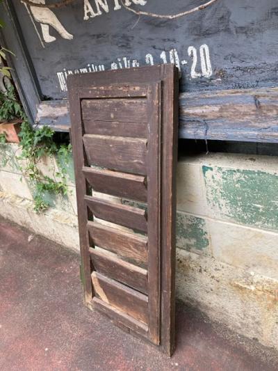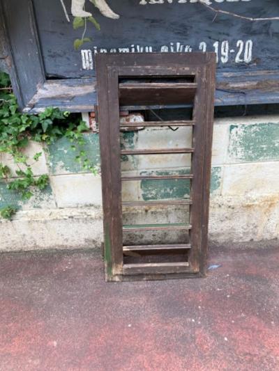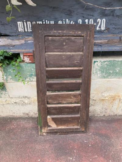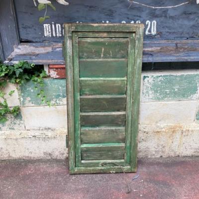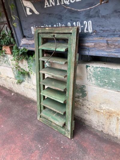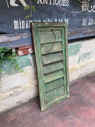 グリーンのペイントが剥がれ素敵な雰囲気を持つルーバー付き窓枠が入荷しました。【39-232A】イギリス製、推定1940年代。細長い金具が付属している方が上向きかと思われますが、上下どちらでも使用可能です。金具は恐らく開閉した際の固定具として付いているようですが、現在はルーバーの部分のみ開閉できました。片方には取り付け用金具のようなものが付属、裏面には丁番が固定されていました。お好みにもよりますが強度の都合上、屋外で雨戸としてのご利用よりは室内でお花やインテリア雑貨と組み合わせてディスプレイ的なご利用の方が安心かもしれません。反射が少ない素材感ですので、撮影の背景などにも映えますね。取り付けをご検討の方は、ご自身の契約されている施工業者さまにお問合せください。シャビ―なお部屋作りを楽しんでいる方におすすめ。福岡市南区の店舗にてお渡しもできますのでお気軽にどうぞ!