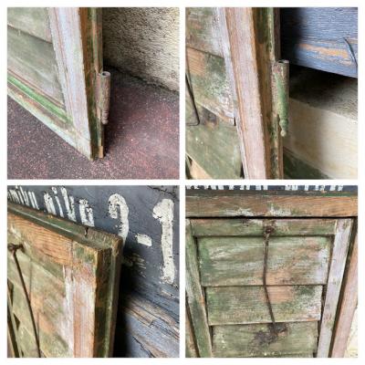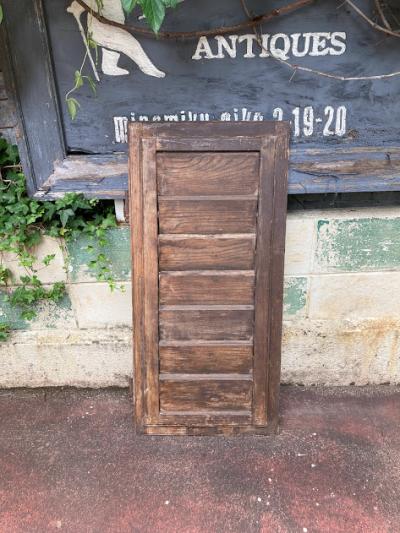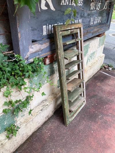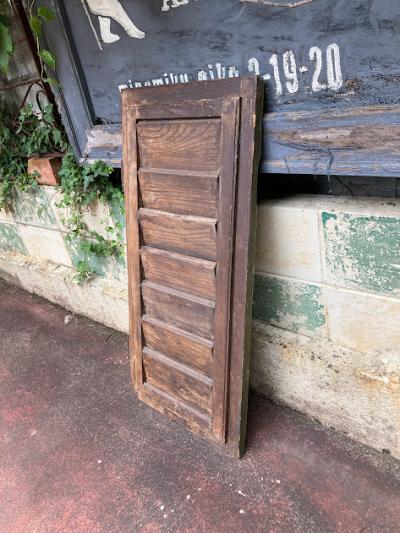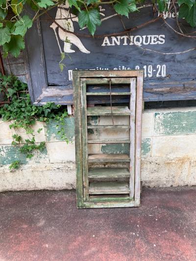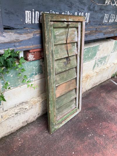 グリーンのペイントが剥がれ素敵な雰囲気を持つルーバー付き窓枠が入荷しました。【39-232B】同じデザインの商品を掲載しておりますがペアではありません。こちらの方がより使い込んだ雰囲気です。イギリス製、推定1940年代。細長い金具が付属している方が上向きかと思われますが、上下どちらでも使用可能です。金具は恐らく開閉した際の固定具として付いているようですが、現在はルーバーの部分のみ開閉できました。片方には取り付け用金具のようなものが付属、裏面には丁番が固定されていました。お好みにもよりますが強度の都合上、屋外で雨戸としてのご利用よりは室内でお花やインテリア雑貨と組み合わせてディスプレイ的なご利用の方が安心かもしれません。反射が少ない素材感ですので、撮影の背景などにも映えますね。取り付けをご検討の方は、ご自身の契約されている施工業者さまにお問合せください。シャビ―なお部屋作りを楽しんでいる方におすすめ。福岡市南区の店舗にてお渡しもできますのでお気軽にどうぞ!