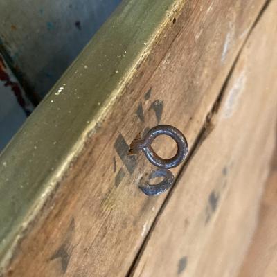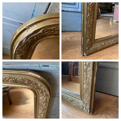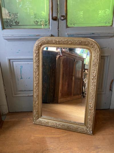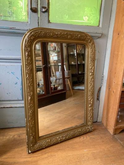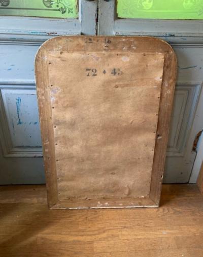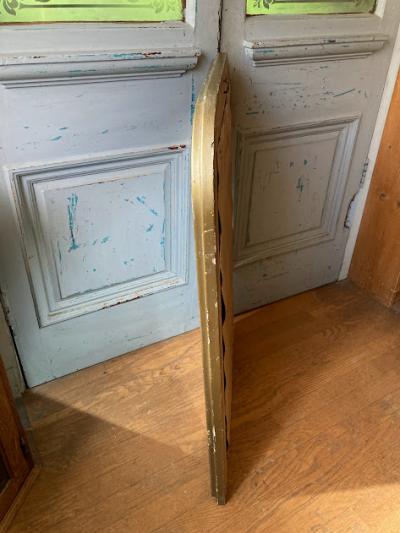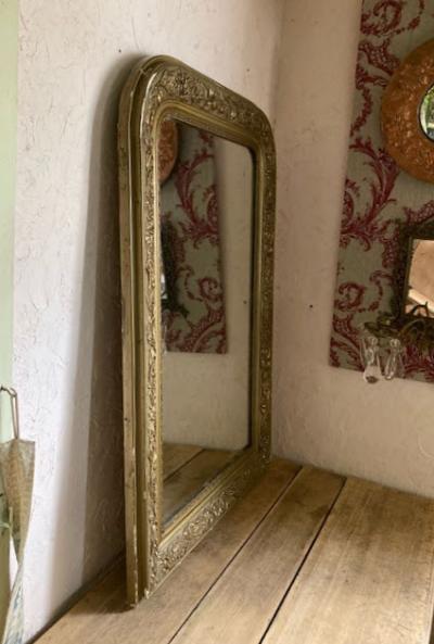 鈍いゴールドをまとった素敵なフランスの大きな鏡。裏面の上部に金具が取り付けてありました。恐らく設置した時、前に倒れないように固定するための金具ではないかとのことでした。フランス製、推定1940年代とのこと。額のゴールド部分は漆喰でデザインされており所々傷があります。これ以上破損が進まないように固定しておりますが、時代を感じる雰囲気を残したいのであえて埋めたりはせず元の状態のままにしてあります。鏡の上部に少し曇った部分があります。光の当たる角度で白く見える時、見えない時があります。周りの小さな傷や古いガラスの状態も含め古い雰囲気がお好きな方や、店舗などでインパクトのある鏡をお探しの方におすすめ。ピカピカの新品をお求めの方はご遠慮ください。福岡市南区の店舗にてお渡しもできますのでお気軽にどうぞ!