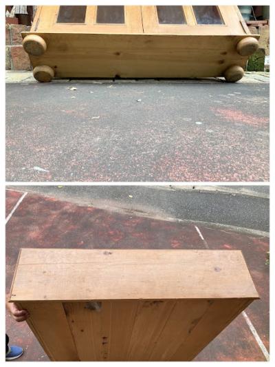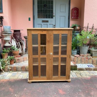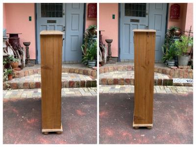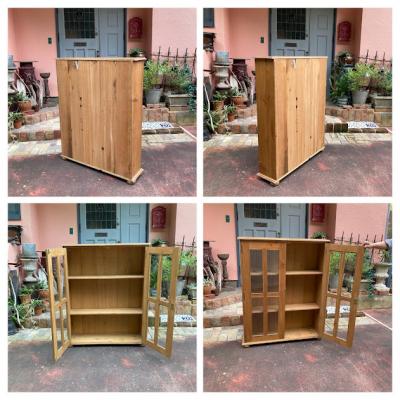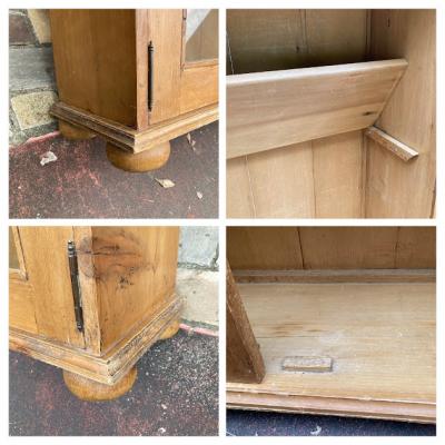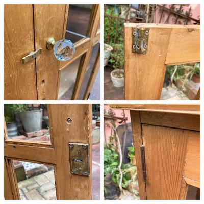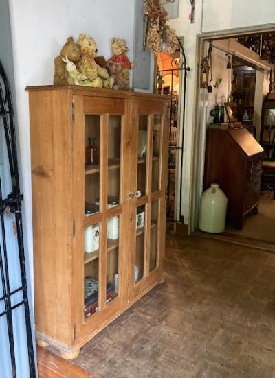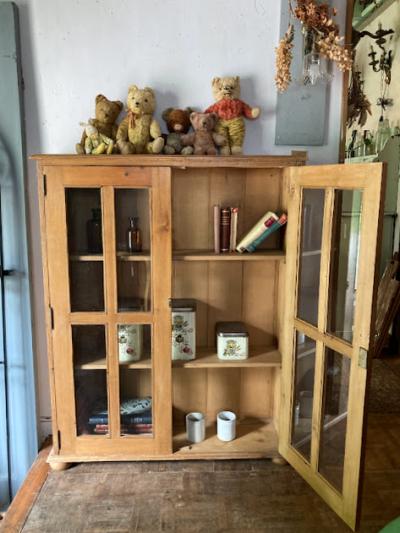 キラキラと輝く取手が付いたオールドパインシェルフ入荷しました【42-125】イギリス製、推定1950年~60年代とのこと。プラスネジとマイナスネジが混在しています。厚みが26㎝という薄さは置き場所を選ばずに使えて便利ですね。このタイプのシェルフは前面の扉を同時に開くと前方に倒れてきますので、必ず片方ずつ開閉するように気を付けてください。(撮影時は後ろから支えています)できれば地震の起こる日本では壁面に固定しておく方がより安心です。左の扉の内側に固定用の金具1か所、正面に小さな固定用の金具が1つ付属しています。棚の高さは固定されており、1段目、3段目が高さ約36㎝、2段目のみ高さ約42㎝と微妙に違います。鍵穴がありますが、専用の鍵はありませんでした。長く使い込み届いたその日からご自身のお部屋にずっとあったような佇まいの家具をお求めの方や、店舗什器をお探しのおすすめ。ピカピカの新品をお求めの方はご遠慮ください。福岡市南区の店舗にてお渡しもできますのでお気軽にどうぞ!