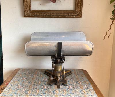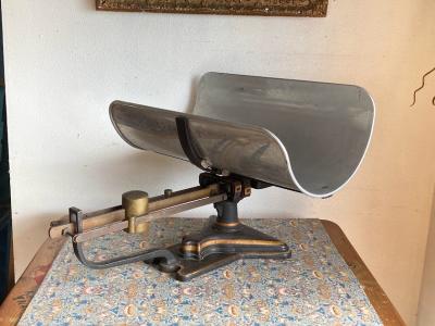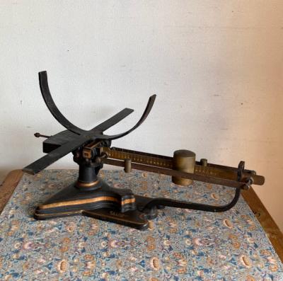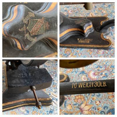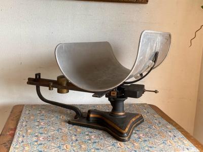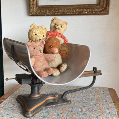 かなり珍しい赤ちゃん用体重計が入荷しました()【1-B】18世紀初頭にイギリスで設立され1818年にW. & T. AVERYという社名に変更後、第2次世界大戦の戦火も乗り越え、社名を変更しながら2000年まで精密機器を製造していた会社の量りです。鋳造のしっかりとした造りに加え、鮮やかな金彩を施すあたりは、この時代の芸術性の豊かさを感じさせてくれます。シルバーの部分(クマが乗っているところ)に赤ちゃんを乗せ、反対側の左右に動く重り3つを動かして体重を計測していたようです。赤い矢印で示した部分が可動します。数多く赤ちゃんの成長を見守ってきたのだなぁ、、と思うと感慨深いものがありますね。全体的に非常に美しい佇まいを残していますので、ディスプレイや撮影小物、植物などを組み合わせて癒しの空間を作るお手伝いが出来そうですよ。シルバーの部分は取り外しができたので、分解して梱包します。福岡市南区の店舗にてお渡しもできますのでお気軽にどうぞ!