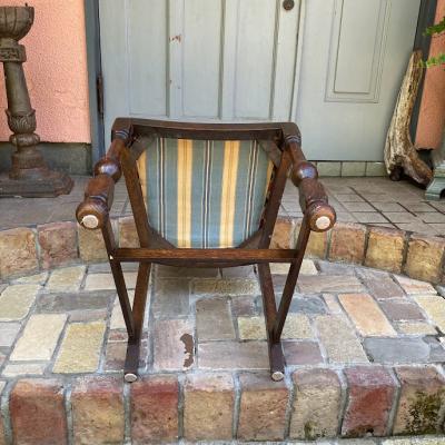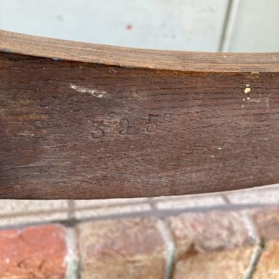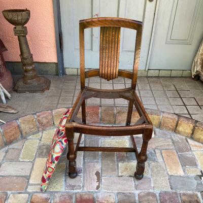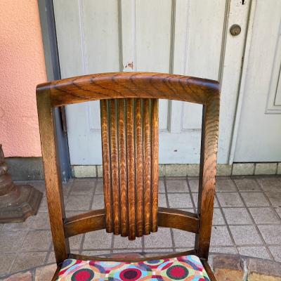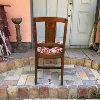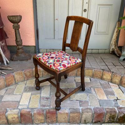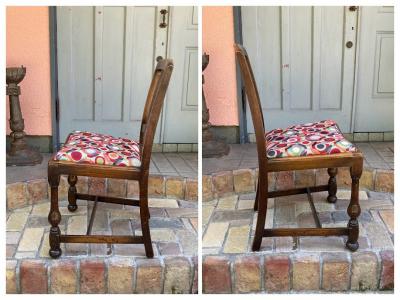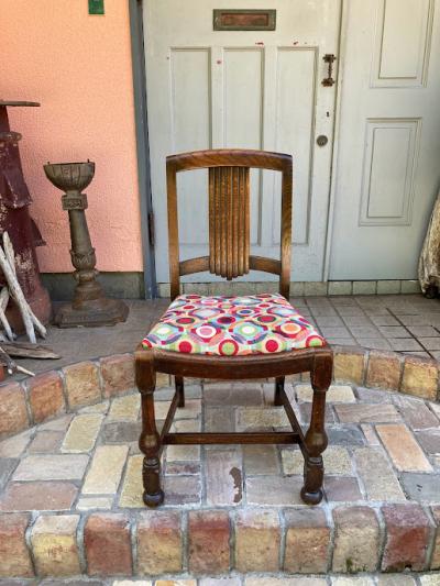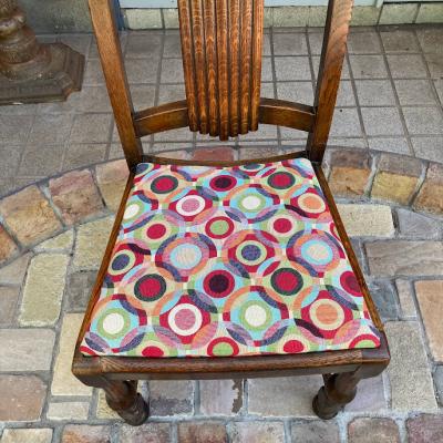 オーク材のダイニングチェアは、イギリスのカラフルな生地で新しく張り替えました。【40-1093】座面の鮮やかな色彩は、シンプルなオークのデザインと相まって、お部屋に明るい雰囲気を作ってくれます。裏面には数字が刻まれており、現代にはない昔の人の手仕事を感じさせますね。裏面生地はオリジナルの生地を再利用してあり、アンティークの味わいがあります。1930年代に作られたと推定される椅子ですが、メンテナンス済みですぐに使える状態です。底についているフェルト現地で貼られていたものですが、必要に応じて外せます。このチェアはお部屋に華やかさと温かみを添えてくれることでしょう。