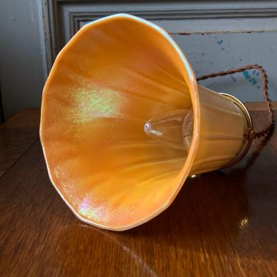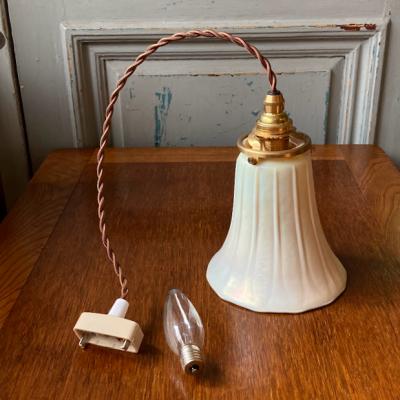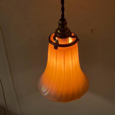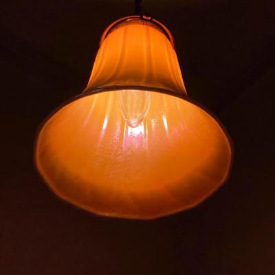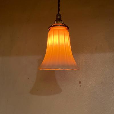 このイギリスのガラスシェードは、白い外側とオレンジ色の内側という鮮やかな対比が目を引きます。表面はまるで貝殻の真珠層のような美しい光沢が施されています。灯りをつけると、オレンジ色の優しい光が部屋に広がりますよ。心安らぐ雰囲気を作りたい方にぴったりです。年代不詳、イギリス製。口金サイズはE17に交換済み、LED電球にも対応します。コードの色は、「ブラウン・ブラック・ホワイト」からお好きな色を、長さは1mまではご希望の長さに無料で調整できます。ご希望がない場合は撮影に使用したコード:ブラウン、長さ約50㎝にてお届けいたします。こちらのシェードは同じデザインの物がもう1個ありますので2個ご利用の場合はお知らせください。福岡市南区の店舗にてお渡しもできますのでお気軽にどうぞ!