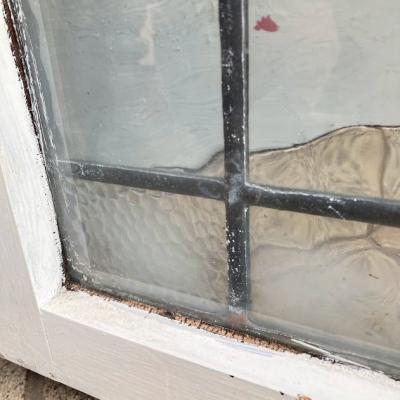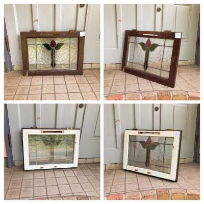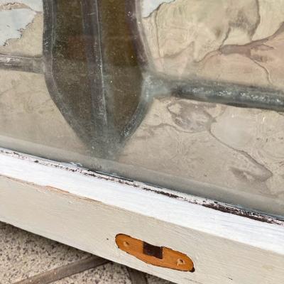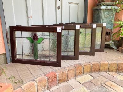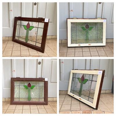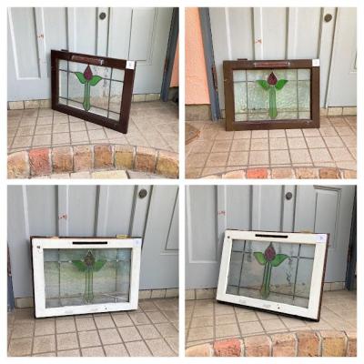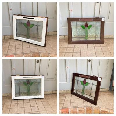 イギリスでは風が強い地域などで使われている2重のステンドガラス。白くペイントされている面には透明のガラスがはめ込まれており強度を増してあります。そのため1枚当たり約6キロとやや重さがあるガラスとなります。構造の都合上ガラスを取り外すことができないため、内側には曇りがあります。新築やリフォーム、リノベーションなどで同じデザインのガラスをお探しの方へおすすめ。取り付けにつきましてはご自身の契約されている施工業者さまにお問合せください。破損を考慮し枠の取り外しなどは行っておらず現状のままでお渡しとなります。Aのみ枠に何も付いていませんが、B/C/Dには通気用の穴があり、枠の部分にはそれぞれ取り外した際の傷などがあります。福岡市南区の店舗にてお渡しもできますのでお気軽にどうぞ!