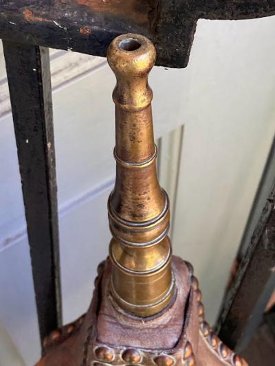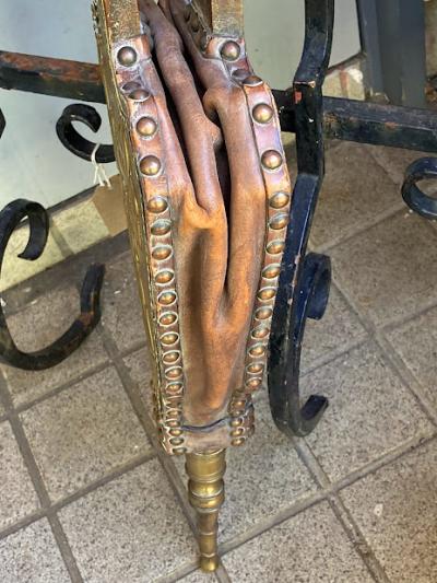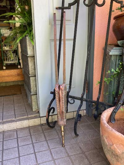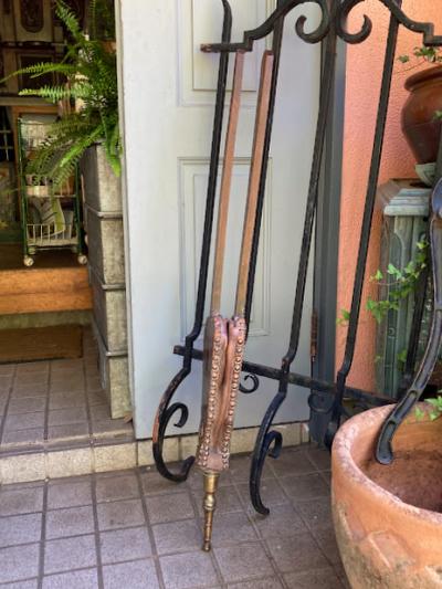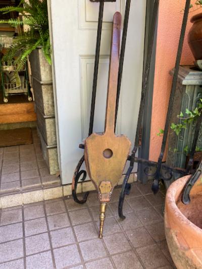 1900年代に作られたという、真鍮製のふいご(火起こし)が届きました。【43-50】ケルト文様の立体的な装飾が目を引く一品です。ファンタジー映画にもすんなりと馴染みそうな佇まいです。オーク材のしっかりとした造りで、空気を送り込む機能もしっかりしており実用性もあります。雰囲気を残したいので、あえてピカピカには磨かず乾拭きのみ行いました。大きなサイズで存在感があり、撮影小物やインテリアをお探しの方におすすめ。