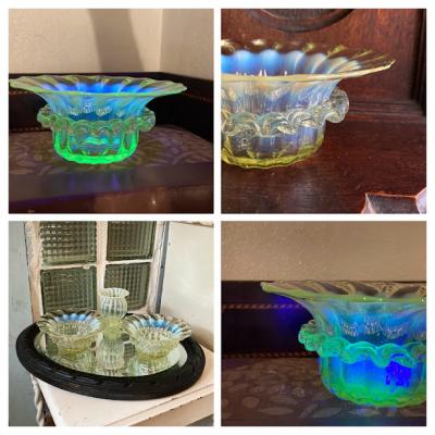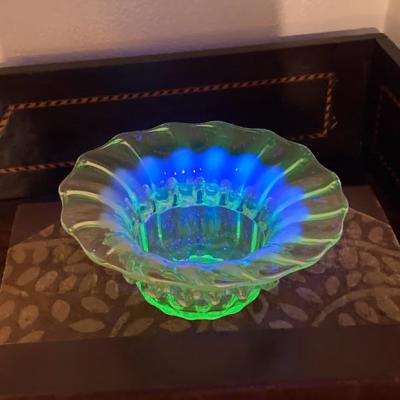 ウランガラスは1830年代からヨーロッパで作られ始めました。ウランを加えることで、ガラスは黄色や緑色の魅力を身につけました。昔は紫外線ランプ(ブラックライト)がなかったので、夜明け前の空が青くなる紫外線が多い時にガラスが光ることを、非常に驚いたことでしょう。大きなカケもなくとても良いコンディションです。ジャム入れとしてはもちろん、窓辺のインテリアとしても活躍しそうですね。福岡市南区の店舗にてお渡しもできますのでお気軽にどうぞ!