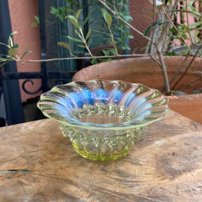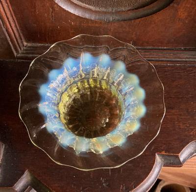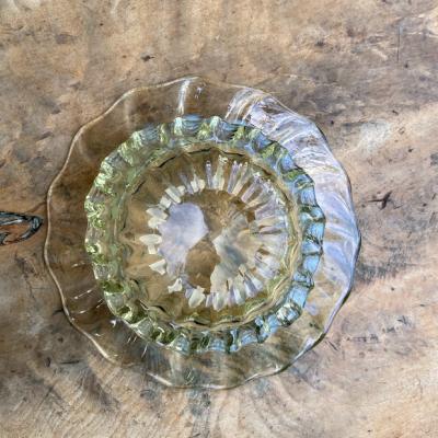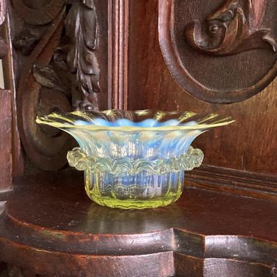 このガラスの容器は、ジャムを入れるために19世紀末頃に生まれました。側面にはガラスのフリルが咲いており、愛らしい姿を見せています。ガラスの内部には古いガラス特有の気泡を含みます。このガラスは人体には影響のない微量のウランを秘めており、紫外線に触れると独特な緑色の光を放ちます。これがウランガラス(ワセリンガラス)と呼ばれる理由です。