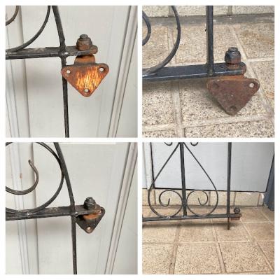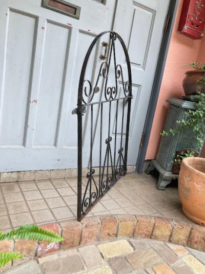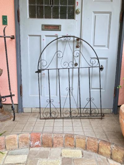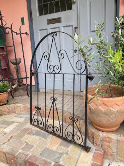 英国のお庭で使用されていた低めのアーチゲート【43-43】ゆるやかな曲線で描かれたカーブがヨーロッパらしく華やかな印象です。こちらは高さ約100cmほどの低いタイプですので、一人での移動もしやすいサイズ。気分に合わせて室内の壁面に設置しても素敵ですよ。アンティーク特有のサビや傷なども含みますが、植物との相性はピッタリです。レバーは上下に可動し、サイドには固定用の穴が開いた三角形のパーツが2か所付属しており動きます。金具の出っ張りがあるので斜めにみえますが、本体はまっすぐの造りです。福岡市南区の店舗にてお渡しもできますのでお気軽にどうぞ!