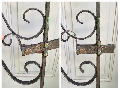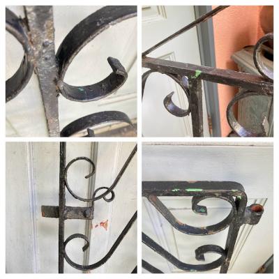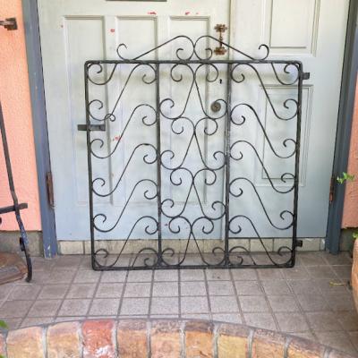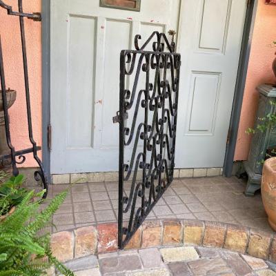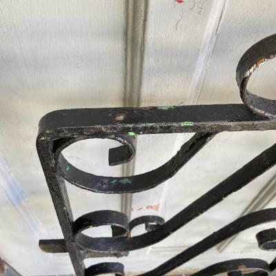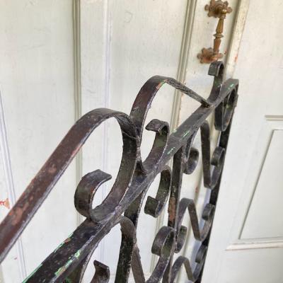 英国の庭で使用されていたアイアンのゲート【43-75-2】たくさんの曲線を組み合わせたデザインは、ヨーロッパらしく華やかな印象です。推定1920年代。こちらのゲートは重量があるので、やや大きなサイズの固定用フックを付属しています。アンティーク特有のサビや傷なども含みますが、植物との相性はピッタリです。レバーは上下に可動しました。