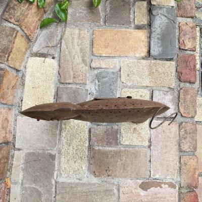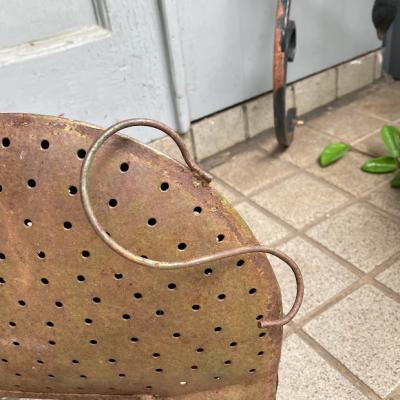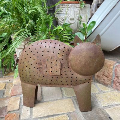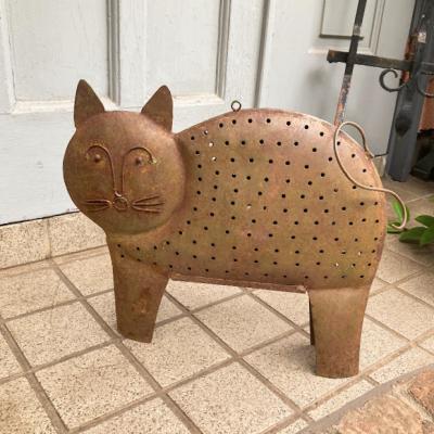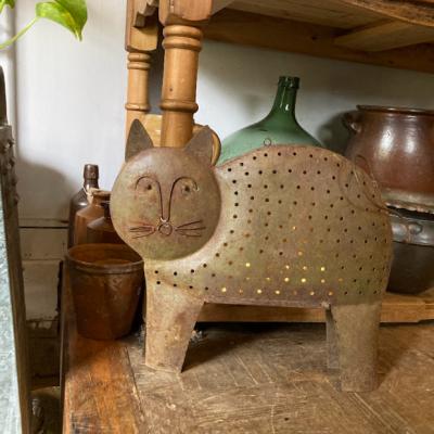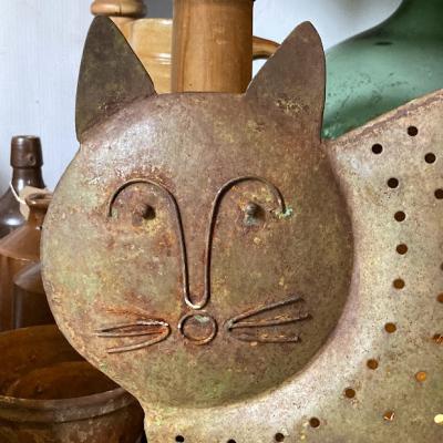 ガーデニングが盛んなイギリスらしい愛らしい表情をした猫のシェードが届きました!裏側には小さな扉が隠されていて、キャンドルや電球を入れられるようになっています。電池式の電球を入れてみたら、猫の身体に開いている穴からキラキラと光が溢れ出してきました。サビが彫刻のように美しい猫のシェードは、グリーンとも相性抜群です。玄関先に置くと、お客様を驚かせること間違いなしですね。壁にも掛けられますので、目を引くアートに早変わりです。サビ好きさんにおすすめ。年代不詳、イギリス製。