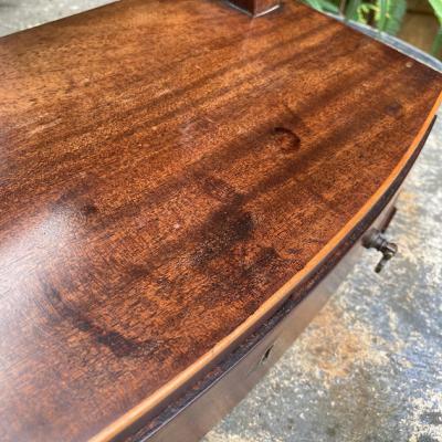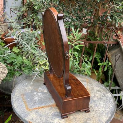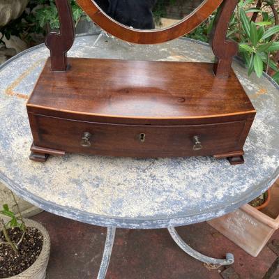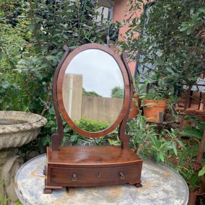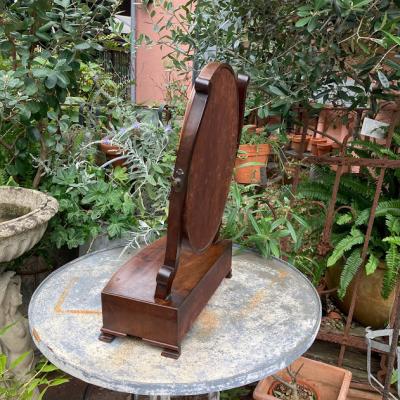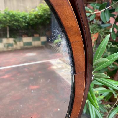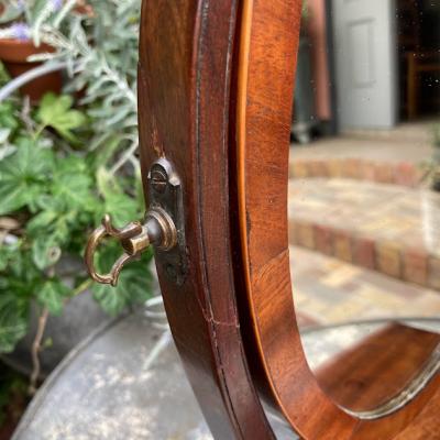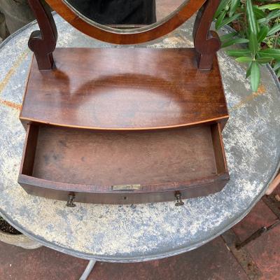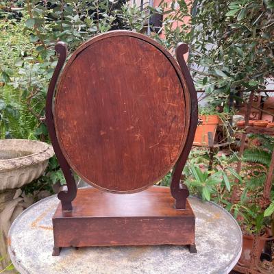 このミラースタンドは、マホガニーで作られた楕円形の美しいデザインです。小さな引き出しには、アクセサリーや小物を収納できますね。1930年代に作られたと推定されるこのミラースタンドは、長い年月を経ても色あせない魅力を持っています。鏡には、多くの人々の笑顔を映し出した証として、アンティークならではの曇りや修復跡がありますが、それがかえって味わい深さを増しています。小さな鍵穴がありますが、鍵は残っていません。それもまた、このミラースタンドの歴史を感じさせるポイントです。傷や汚れも含めて、古い家具の持つ独特の雰囲気に惹かれる方におすすめです。