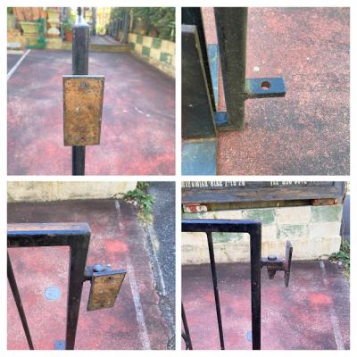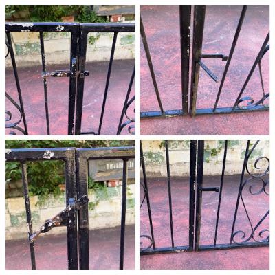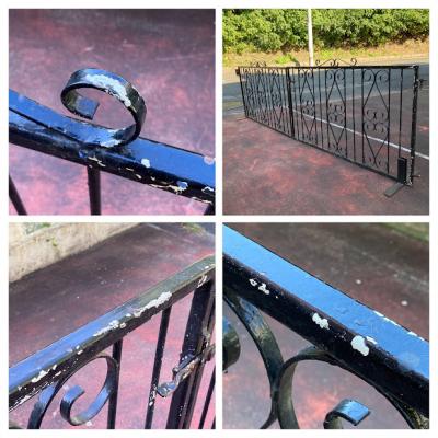 お庭や玄関を華やかにしてくれるワイドな両開きのアイアンゲートが届きました。【43-41】イギリス製、推定1930年代。片方には、可動式プレートのパーツが付属。反対側の上部には固定用のボルトが付属していました。ペイントの剥がれやサビを含みますが、時代を経た独特の存在感を創り出してくれます。ブルーやホワイト、グリーンなどお好きな色にペイントしてもいいですね。中央には左右のゲートを固定するフック、地面に固定するバーが付いています。撮影に使用したスタンドは付属しません。スタンドが必要な方には、別途オーダー(1~2週間)で作成できますのでお気軽にお問合せください。つる性の植物を絡ませても素敵ですね。1枚につき約17㎏と重さがありますのでしっかりと固定してご利用ください。