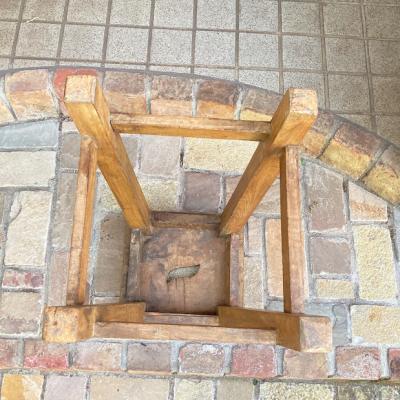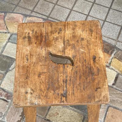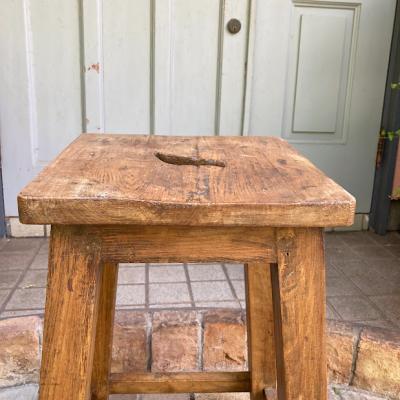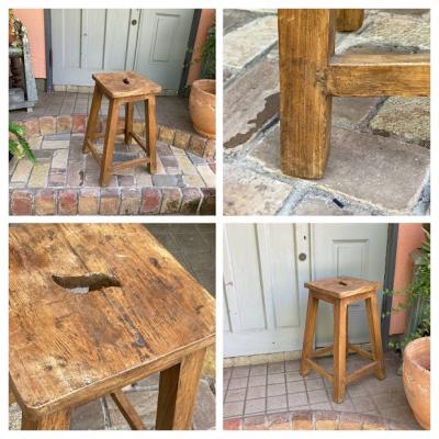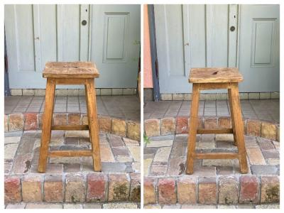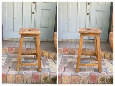 木の風合いがとても素敵なハイスツールが届きました。【43-469】推定1930年代、イギリス製、ソリッドオーク。座面に開いた穴は、持ち運びに便利なだけでなく、独特のデザイン性もあります。しっかりとした造りで安定感もあり、約67㎝の高さはちょっと腰掛けたい時にちょうど良い高さかと思います。一般的な椅子の高さのスツール(約46㎝)と比較している画像をご覧ください。お部屋のコーナーに置いて小物やバッグを飾る定位置にもピッタリですね。ナチュラルな雰囲気がお好きな方におすすめ。座面はほぼ平ですが、自然な素材を使用してあるため厚みは均等ではありません。そこも一つのポイントとしてお楽しみください。