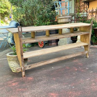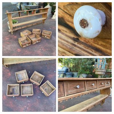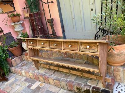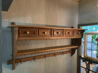 オールドパインの大きなウォールラックが届きました。1920年代、フランス製。横幅が約145cmありかなり大型。5個の引き出しに加え、真鍮のフックも付いていて収納力も抜群です。引き出しのつまみは陶器製。キッチンだけでなく、玄関や店舗などでも使える多様性も魅力的ですね。シャビーシックな雰囲気が漂うオールドパインの質感や色合いは、古い家具ならではの味わいがあります。左から4番目のパーツにはカケがあり、一番右側のフックが欠けていますが、それもまたこの家具の歴史を感じさせてくれます。素朴で温かみのあるデザインは、お部屋に優しい印象を与えてくれることでしょう。