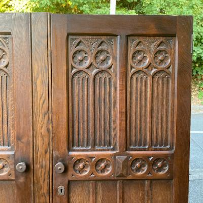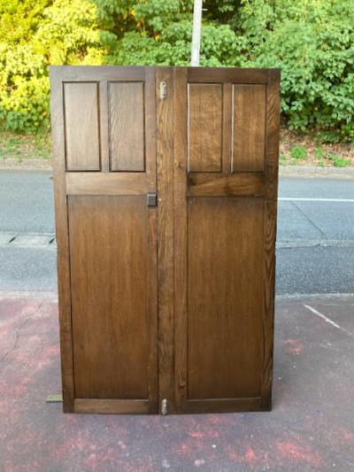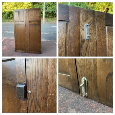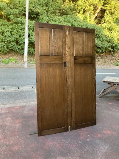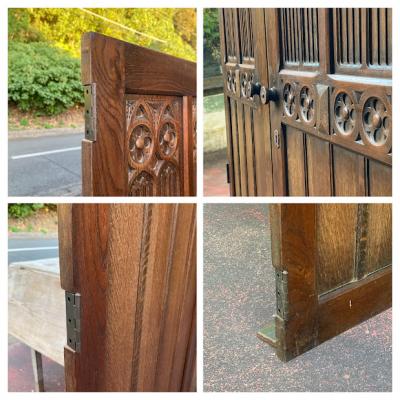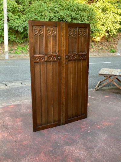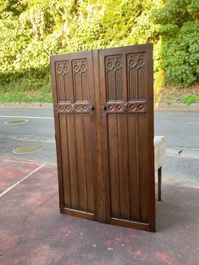 歴史を感じる両開きの扉が届きました。【43-421】推定1940年代に造られたこの扉は、かつてワードローブの一部だったそうです。ゴシック調のデザインは、お店やお部屋に重厚感のある雰囲気を演出してくれますね。備え付けられていたワードローブに合わせて造られた扉は、左右の幅が9㎝ほど違います。自宅のサイズに合わせて家具をオーダーする、イギリスらしい配慮です。サイドに丁番が6個付属していますが、このまま壁面の装飾や、雰囲気のある仕切りなどにおすすめ。