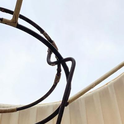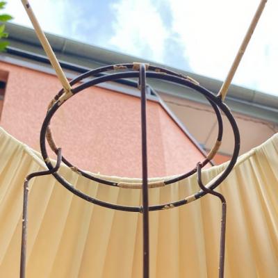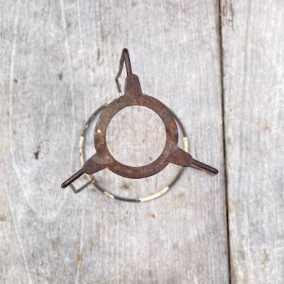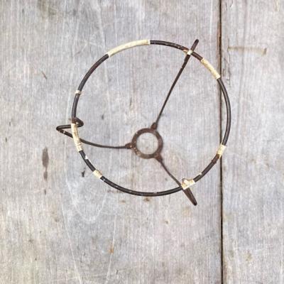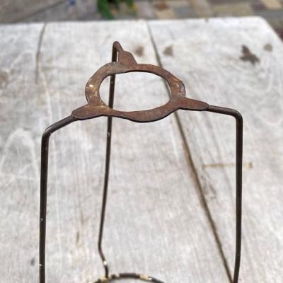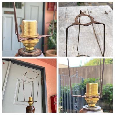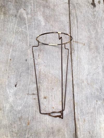 イギリスの大きなシェードに取り付けるランプシェードキャリー(ランプシェードキャリアとも言うそうです)【43-STP2】。こちらは出っ張りのある所から下までの長さが約19、5㎝のやや長いサイズになります。円が広い方が上向きで、3カ所の飛び出ているところにシェードの中央の輪が乗る仕組みになっています。縦長のシェードなどにいいですね。こちらは表面の被膜は剥がれ、ねじ止めするところが少し曲がっていましたが、しっかりと固定はできました。古い大きなシェードをお持ちでパーツのみをお探しの方向き。福岡市南区の店舗にてお渡しもできますのでお気軽にどうぞ!