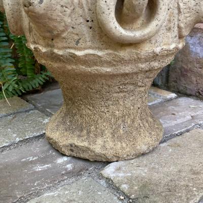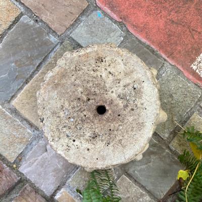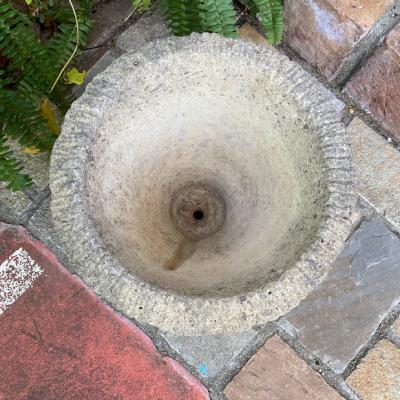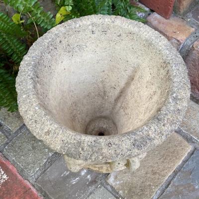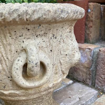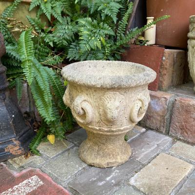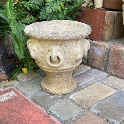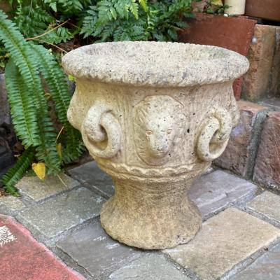 イギリスから存在感のあるガーデンポット(セメント鉢)小サイズが届きました。【43-396R】こちらには獅子の顔とリングのモチーフが施されています。ドアのノッカーや家具のモチーフなどでも見かけるデザインなので、見たことがあるかもしれませんね。外側は丸みを帯びたデザインですが、内側は細長い円錐形をしています。底に向けて排水しやすいように溝が1本入っていますので、お好きな植物を直接植えることもできます。風合いを残したいので、ブラシでホコリのみ払ってあります。年代不詳。イギリス製。福岡市南区の店舗にてお渡しもできますのでお気軽にどうぞ!