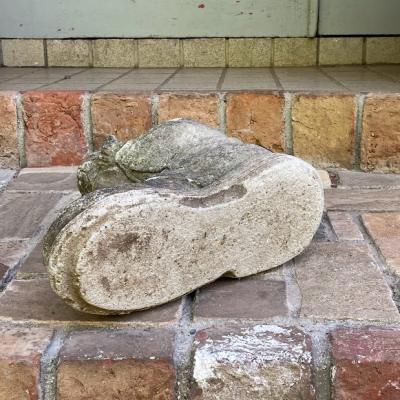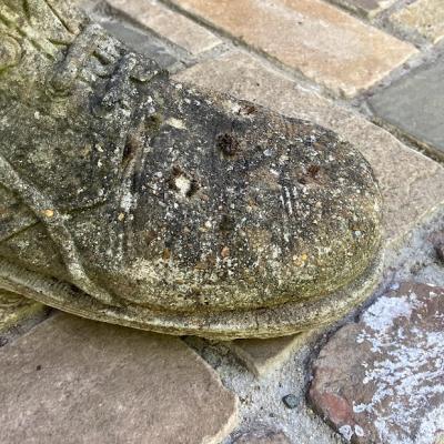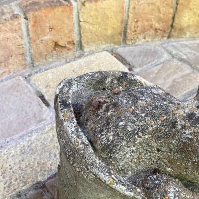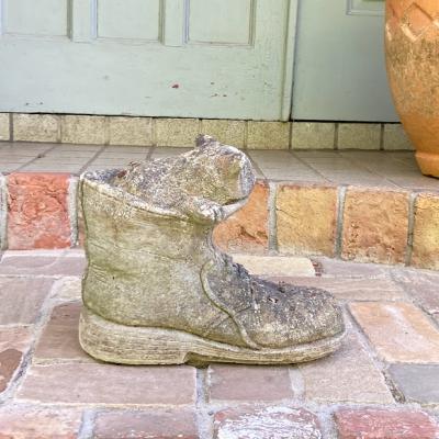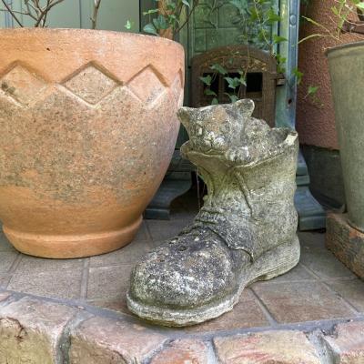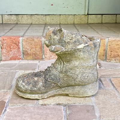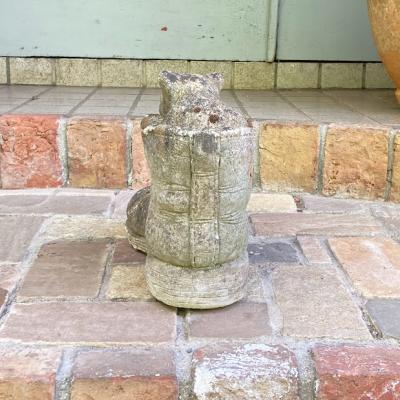 大きなブーツの中から小さなネコがひょっこりと顔を覗かせている愛らしいガーデンオブジェです。【43-394-1】イギリス製。年代不詳。ブーツのヒダや靴紐も細かく表現されていて玄関やお庭を彩ってくれそうです。風合いを残すためブラシで大きなホコリのみ払ってあり、ブーツのかかとや甲には小さなコケが生えています。これからも時間が経ち、全体的な色合いがどんどん変化していくのが楽しみなお品です。