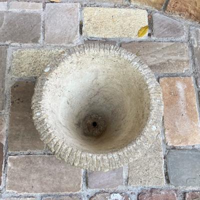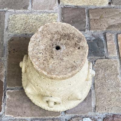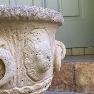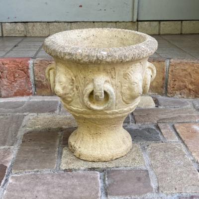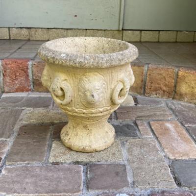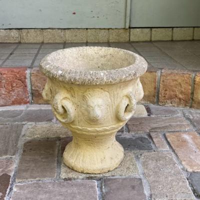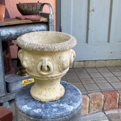 イギリスから存在感のあるガーデンポット(セメント鉢)小サイズが届きました。【43-396R2】こちらには獅子の顔とリングのモチーフが施されていますが、クリーム色の優しい雰囲気です。ドアのノッカーや家具のモチーフなどでも見かけるデザインなので、見たことがあるかもしれませんね。外側は丸みを帯びたデザインですが、内側は細長い円錐形をしています。内側の側面にシリアルナンバーのようなものが記載されています。底には穴も開いているので、お好きな植物を直接植えることもできます。風合いを残したいので、ブラシでホコリのみ払ってあります。年代不詳。イギリス製。