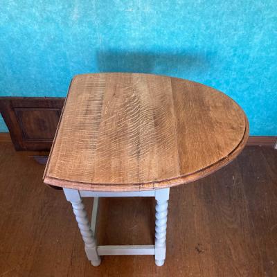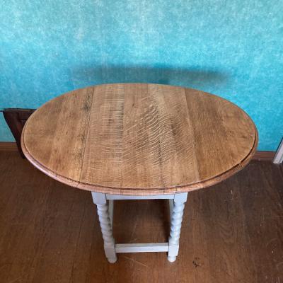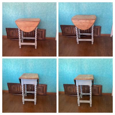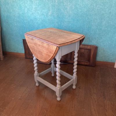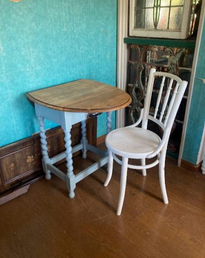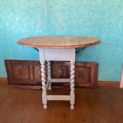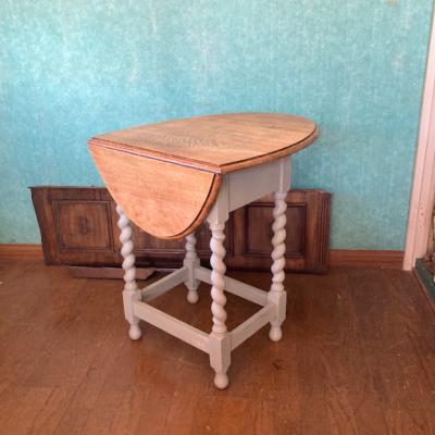 パステルカラーでペイントされ、やさしい雰囲気の小さなバタフライテーブルが届きました【43-278】天板下にある金属製のパーツは、ワンタッチで操作できて便利です。木製のパーツが多い中、この金属製のパーツは珍しいですね。天板は、壁につけて半分にしたり、両方とも広げたりと、使う人のニーズに合わせて調整できます。スペースを有効利用したい方にぴったりです。裏面のダイナミックなペンキ跡などは風合いを残すためそのままにしてあります。推定1950年代、イギリス製。撮影に使用した椅子は付属しません。