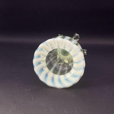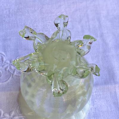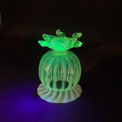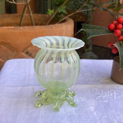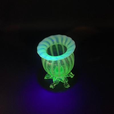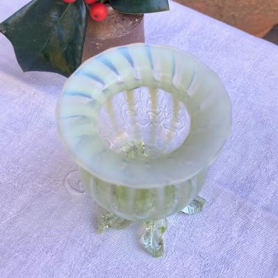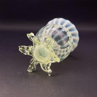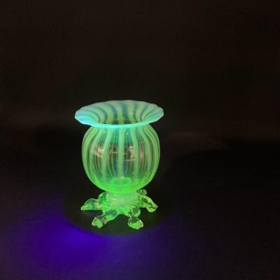 手のひらに収まる小さなヴァセリンガラスの花器が届きました。【43-ur1】ふんわりとした色合いが素敵なアンティークガラスです。19世紀初頭、イギリス製。自然光の下では柔らかな黄緑色と乳白色のガラスが優しい印象を与えますが、ブラックライトを照射すると鮮やかな色彩をまといます。この色の変化はウランを含むヴァセリンガラスならではの魅力です。太陽のように広がる脚の先端(4か所)に少しづつカケがあり、内側にはうっすらと小さな擦り傷を確認できますが、これは大切に使われていた証であり、愛着を感じさせてくれます。これらの状態は価格に反映しておりますので、古い物がお好きな方にはおすすめです。小さなお花やグリーンを入れて窓辺のインテリアとしてお楽しみください。福岡市南区の店舗にてお渡しもできますのでお気軽にどうぞ!