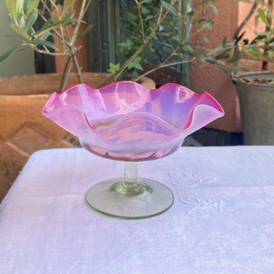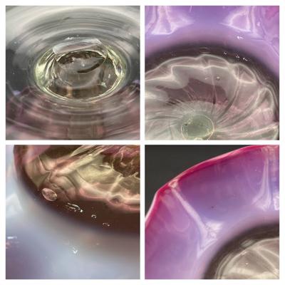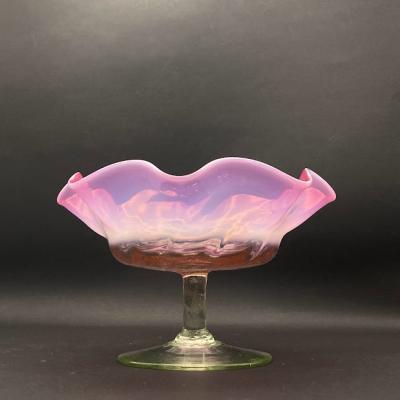 オパリン×ウランガラスのコンビネーションのが美しいコンポートが届きました。手作りの温かみを感じさせるふきガラスで造られており、古いガラス特有の気泡や、小さな混入物を含みます。ブラックライトを照射すると脚の部分が、ウランの効果で色鮮やかに輝きます。自然光の下でも、乳白色のガラスとピンクガラスが淡く重なりほんのり色づく様子は、窓辺のインテリアとして見ているだけで癒されますね。イギリス製、推定1930年代。福岡市南区の店舗にてお渡しもできますのでお気軽にどうぞ!