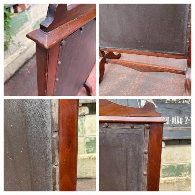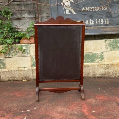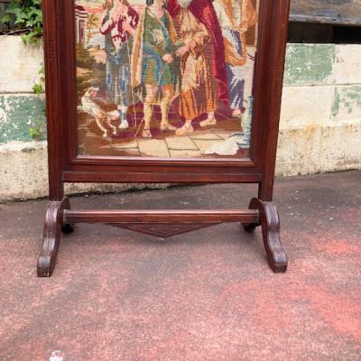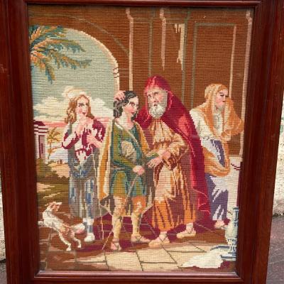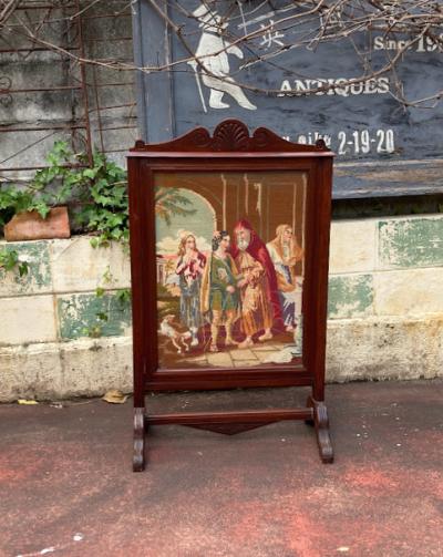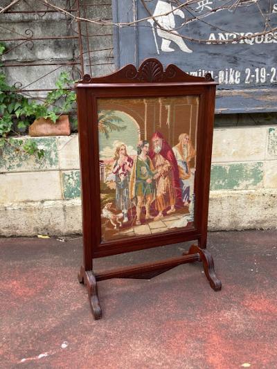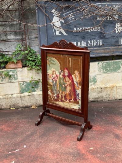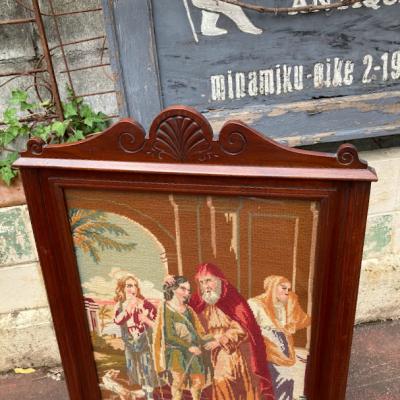 旅に出る若者の姿を美しい刺繍で描いたファイヤーフェンスが届きました【43-275】中央の若者に何かを伝える赤いマントの人物が印象的で、左手には神秘的な光の環を持つ人物も描かれています。手元の杖は旅の長さや困難さを物語っているような一場面ですね。周りは艶やかなマホガニーの枠に囲まれ、ガラスで覆われた表面は刺繍を保護してくれ、お手入れも簡単にしてくれます。大きなサイズで存在感がありますので、このまま作品として飾ることもできますし、パーテーションとしても活躍しますよ。福岡市南区の店舗にてお渡しもできますのでお気軽にどうぞ!イギリス製。推定1940年代。