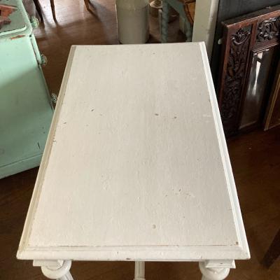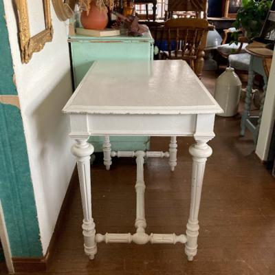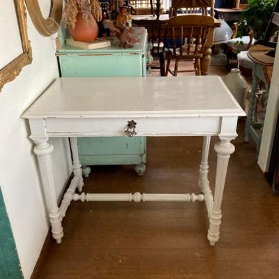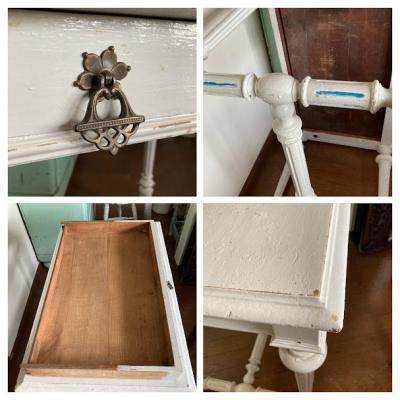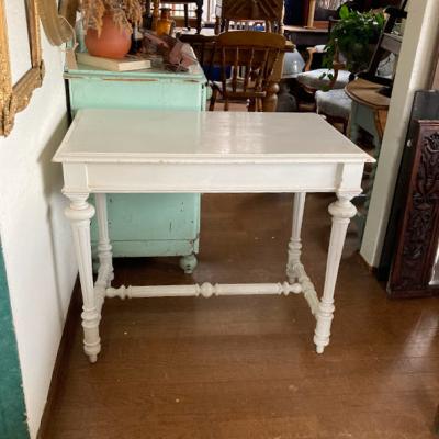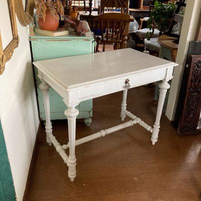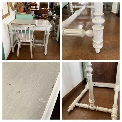 白くペイントされたフランス製の机が届きました。【43-199】大きめの引き出しも付属しており収納力も抜群です。ペイントの層は厚く、裏側にはブルーの塗装が残っていました。何世代にもわたって愛され、しっかりと手入れされてきたことが伺えます。このような机を見ると、物を大切にする心を教えてくれますね。撮影に使用した椅子は座面高さ46㎝の物を使用しています。ペイントの小さな剥がれや傷を含みます。撮影に使用した椅子は付属しません。推定1930年代。福岡市南区の店舗にてお渡しもできますのでお気軽にどうぞ!