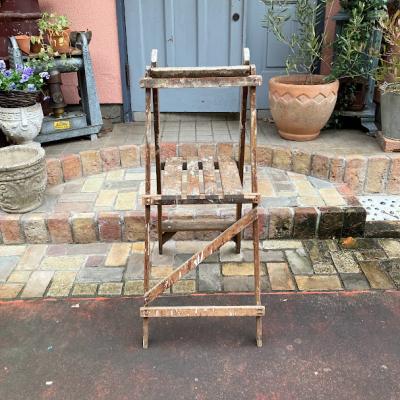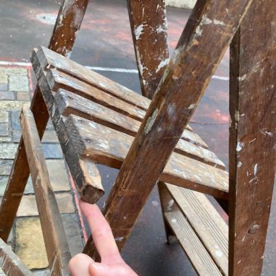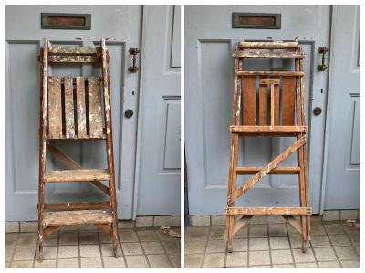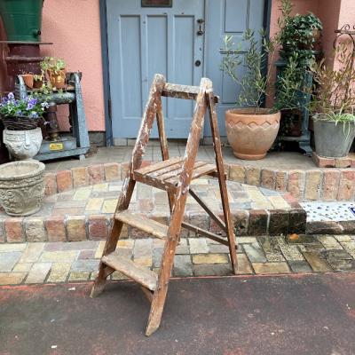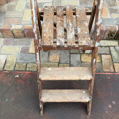 日本の一般的な家にちょうど良いサイズのステップラダー【43-35】が届きました。このような味わい深いステップラダーは、立てかけるだけで雰囲気が出るので、ディスプレイ棚としてよく使われています。しっかりとペイントは残したままにしてありますので、本や植物、小物を飾って楽しんでください。平均的な体重のスタッフが乗り降りしましたが、問題なく使用できました。(使用中の破損は保証できません)イギリス製、推定1950年代。