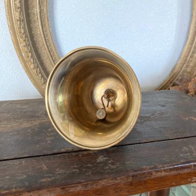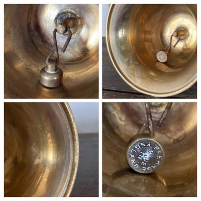 音色が美しい真鍮のベルが届きました。【37-248】かつてイギリスでは中流階級の家庭にも使用人がいたため、それぞれの部屋にこのようなベルが置かれていたそう。現在でも電動の呼び出しベルがある中、手で鳴らすこのようなベルもホテルやバーカウンターで使われているそうです。リーンリーン♪と澄んだ音色に癒されますよ。クリッパーと呼ばれる中央の重りにMADE IN ENGLANDの小さなロゴが刻まれていました。真鍮独特の色合いの変化をお楽しみください。推定1950年代、イギリス製。福岡市南区の店舗にてお渡しもできますのでお気軽にどうぞ!