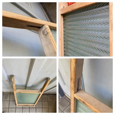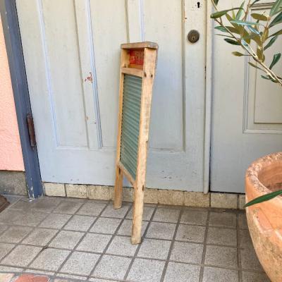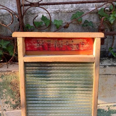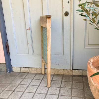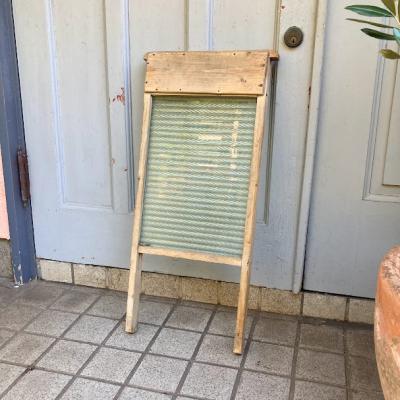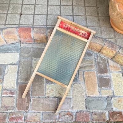 まだ水道が普及しない時代に活躍していたガラスのウォッシュボード(洗濯板)が届きました【43-135】1910年代にイギリスで流通していた洗濯用洗剤「RINSO」のロゴが入っています。表面は波状にしっかりと凹凸があり汚れを落としやすくなっています。裏面は滑らかに磨かれ洗濯物を傷つけないように配慮されています。横の部分には大きな桶などに押し付けて使っていた名残としてへこみの跡があります。当時の人々の様子が目に浮かぶようですね。古びた雰囲気が魅力の洗濯板はお店の看板や、ガーデニングオブジェとして飾っても素敵ですよ。イギリス製、1910年代。福岡市南区の店舗にてお渡しもできますのでお気軽にどうぞ!