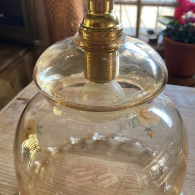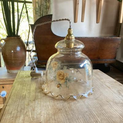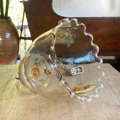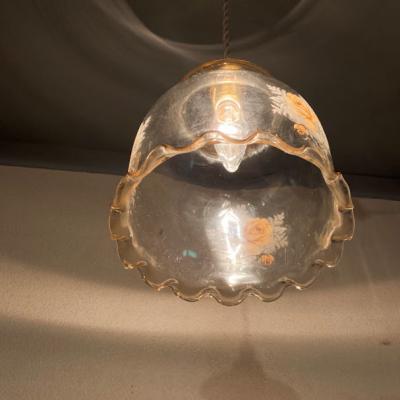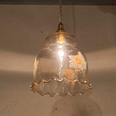 まるでふんわりと広がるドレスのようなガラスシェードが届きました【43-302】透明のように見えますが、ほんのりと飴色できらめくガラスを見るだけでも楽しめる照明です。イギリス製、推定1950年代。側面にはバラの模様を施してあり、点灯すると鮮やかに浮かびあがります。LED電球も使える、口金サイズE17の真鍮ソケットに加え、コードと角型シーリングは新しい物と交換してあります。撮影時コードは白、長さ約40㎝を使用していますが、コードの色「黒、白、茶色、スモーキーベージュ」の中からお好きな色に交換できます。コードのみの長さは50㎝までは無料で調整、50㎝以上の場合は別途有料となりますのでお気軽にお問合せください。福岡市南区の店舗にてお渡しもできますのでお気軽にどうぞ!