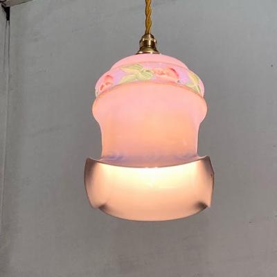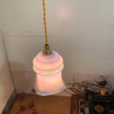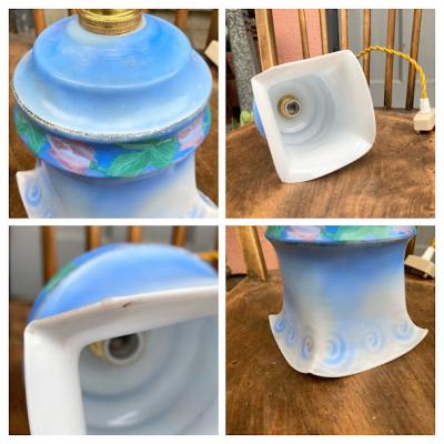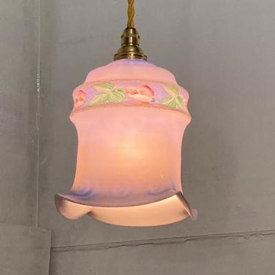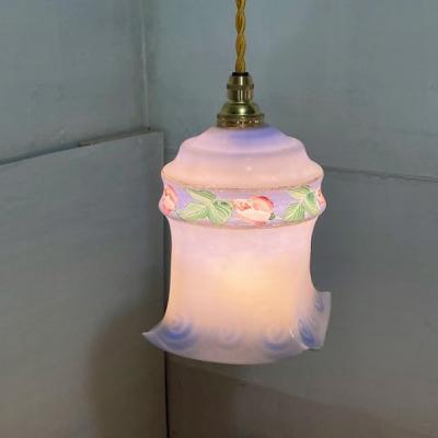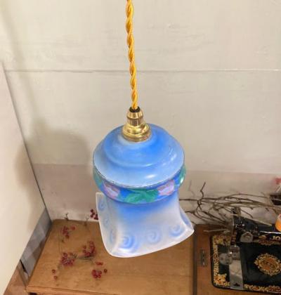 灯りをつけない時でも華やかなブルーが目を引き、電気を付けると色がミックスされ不思議な色合いを演出してくれるガラスシェード【43-557】フランス製、1940年代。ハンドペイントの素朴なチューリップが優しい空間を創り出します。フチにカケたような跡がありますが、現地で丸く削り手直しされながら大切に使われていたようです。ご使用には問題ありませんのでご安心ください。小さな傷を含むため価格に反映しております。シャビーシックなお部屋作りを楽しんでいる方におすすめ。