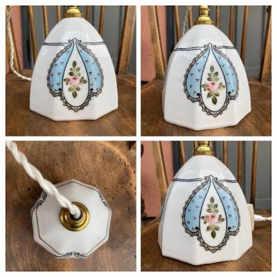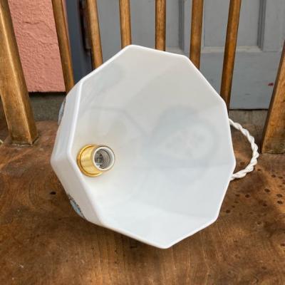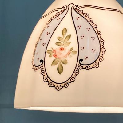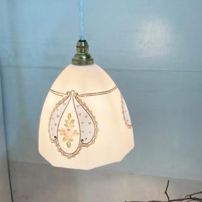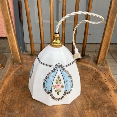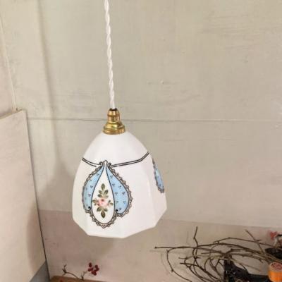 プリンセスのお部屋にピッタリの白いガラスシェードが届きました。手書きで描かれた優しいラインのレースやパステルブルーの色がロマンティックな雰囲気を感じさせてくれます。電気を付けるとガラスが柔らかく反射してお部屋をほんのり照らします。電気をつけない時でも、ガラスの美しいフォルムが目を引きます。推定1950年代、フランス製。大きな傷もなくいいコンディションです。