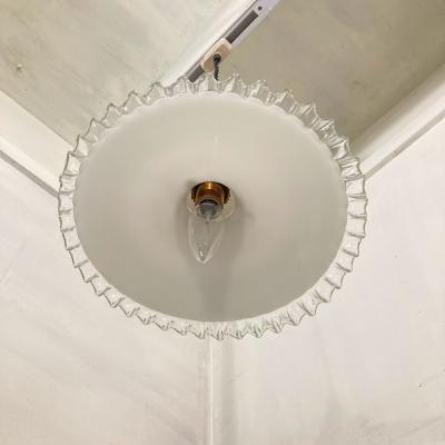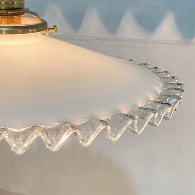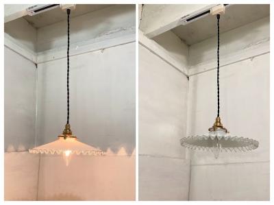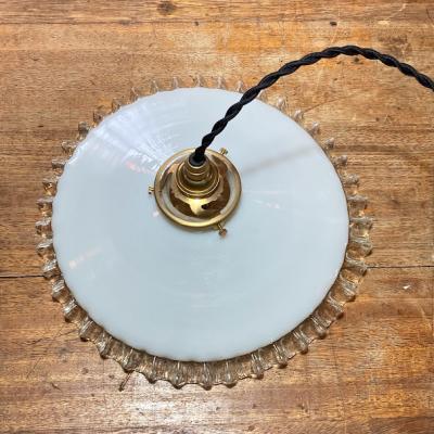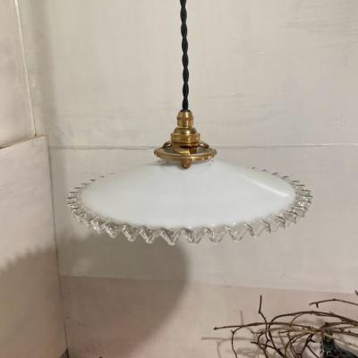 白いガラスに透明フリルが可愛らしいく使いやすいガラスシェードです。【43-469A】フランス製。古いガラス特有の小さな凹みや気泡、製造時に入り込んだ小さな黒い粒を含みます。現地の職人が一つ一つ作り上げたもので、フリルの角度や全体の印象がすべて違います。自分だけのオリジナルシェードとして楽しめますね。壁に映るシルエットも絵になりますよ。こちらはすぐにご利用ができるように引っ掛けシーリング・コード・撮影に使用したお試し用の電球(25W)を付属します。電球は口金E17サイズの25W(クリア)を使用、LED電球も使用できる新品の真鍮ソケットに交換済み。