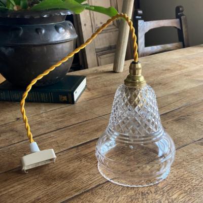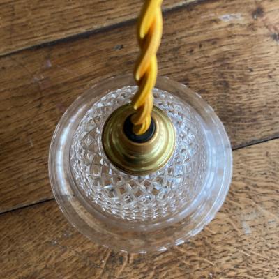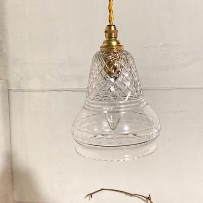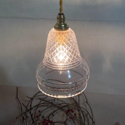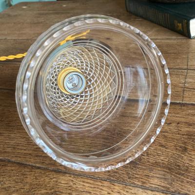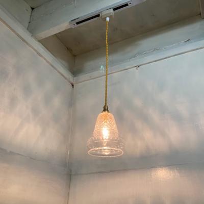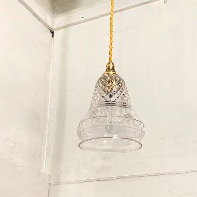 透明なガラスにカットを施した珍しいシェードが届きました【43-289】イギリス製、1930年代。明かりを灯すと、上部に刻まれたガラスの美しい影が壁面に浮かびあがります。シンプルな壁紙でも楽しめる照明です。