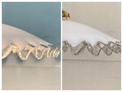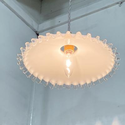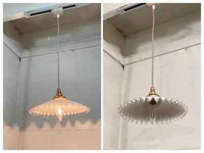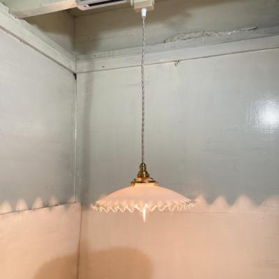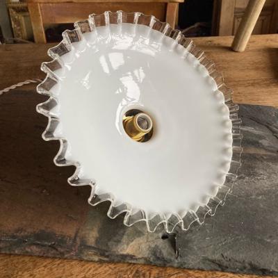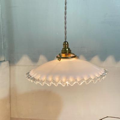 白いガラスに透明フリルが可愛らしいく使いやすいガラスシェードです。【43-470B】フランス製。古いガラス特有の小さな凹みや気泡、製造時に入り込んだ小さな黒い粒を含みます。現地の職人が一つ一つ作り上げたもので、フリルの角度や全体の印象がすべて違います。自分だけのオリジナルシェードとして楽しめますね。壁に映るシルエットも絵になりますよ。こちらはすぐにご利用ができるように引っ掛けシーリング・コード・撮影に使用したお試し用の電球(25W)を付属します。電球は口金E17サイズの25W(クリア)を使用、LED電球も使用できる新品の真鍮ソケットに交換済み。