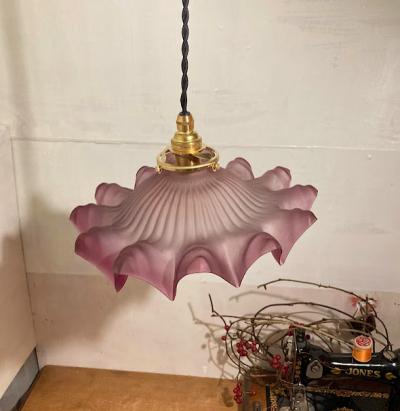 鮮やかなローズが印象的なペンダントライトが届きました。濃いローズからピンク色のグラデーションがとても鮮やかです。フランス製、1920年代。照明器具として使う場合、日本では「明るさ」を優先しがちですが、アンティークのペンダントライトはこの美しいガラスも堪能してもらいたいので、そんなに明るくなくても大丈夫だと思います。撮影時は白熱球25W 電球色を使用しました。口金サイズはE17に交換してありますのでLED電球にも対応します。夜にはアンティークのガラスから優しい光が漏れて、壁に映るシルエットも楽しめます。毎日少しでも、頭を空っぽにして眺めるだけで、とても贅沢な時間を過ごせますよ。自然光の下だとやや紫がかったローズに見えます。