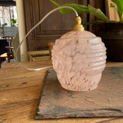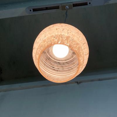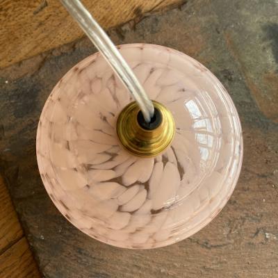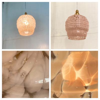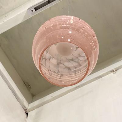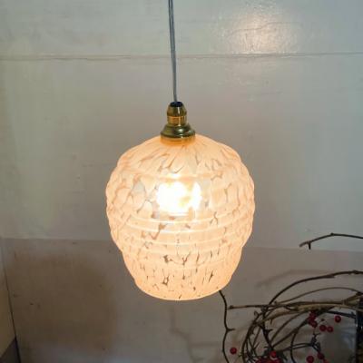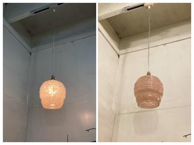ピンクベージュ×透明ガラスを重ねた優しい色合いのペンダントライト【41-261】イギリス製、推定1960年代。古いガラスの特徴である気泡を多く含みます。電球の周りを丸く囲むようなデザインは、お部屋をほんのりと照らしてくれます。独特のコロンとした佇まいが特徴的なので、お客様をお迎えする玄関やお手洗いにも合いそうです。