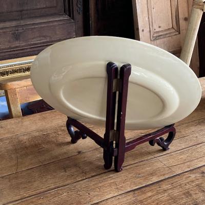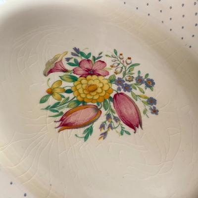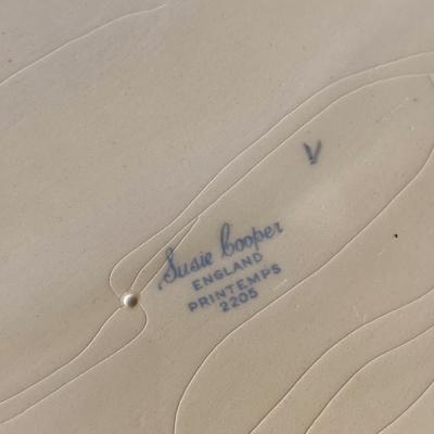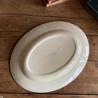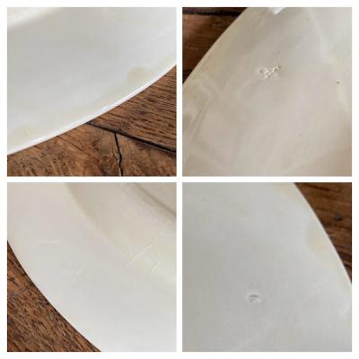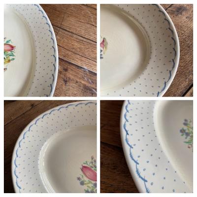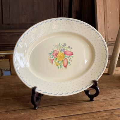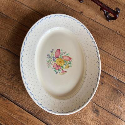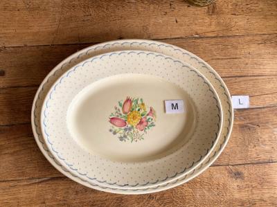 スージークーパー「プランタン」の大きな楕円形のプレート【41-398】約36㎝の「M」サイズです。スージーの作品の中でも人気のデザインで、フチをレースのような模様に小さな雫が取り囲む、とても可愛らしい雰囲気に包まれています。2つサイズを比較した画像がございますが、小さい方のサイズとなります。ホームパーティや、店舗のディスプレイ台としても大活躍してくれそうですね。大きな割れなどはありませんでしたが、古い陶器みられる貫入、裏面に製造時にできた小さな傷を含みます。1930年~64年頃。大きなプレートはお部屋を華やかに彩ってくれますよ。福岡市南区の店舗にてお渡しもできますのでお気軽にどうぞ!