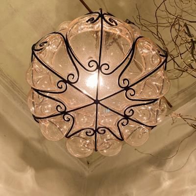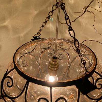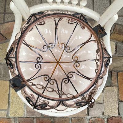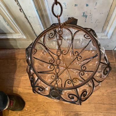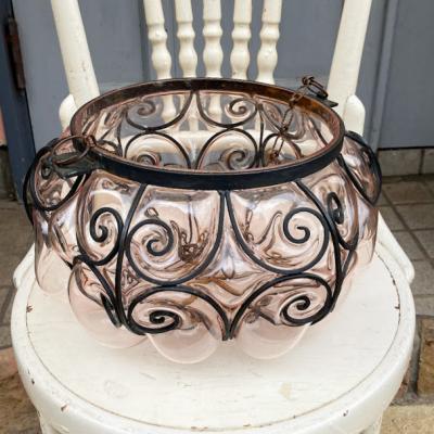 アイアン×立体的なガラスを組み合わせたハンギングボウルが届きました【43-525】明かりを灯すと、まるでファンタジーの世界に誘い込んでくれるようなシルエットを映し出します。フランス製、推定1950年代とのこと。2本のチェーンを一つにまとめて吊るすことができるので、高さを調整することができとても便利です。