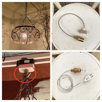撮影は店舗で使用している先端がコンセントタイプ(画像参照)で吊り下げていますが、一般的に使用される角型シーリングに交換してお届け予定です。角型シーリングの下にフックを付属しますので、こちらに本体を吊り下げてご利用ください。画像赤丸参照。赤丸の口金サイズE17の電球使用。コードの色はお好きな色に交換できます。長さは50㎝まで無料調整。50㎝を超える場合は別途有料となります。アイアンの裏側にはサビ、上部内側に小さなカケ、ガラス内部に気泡を含みます。アンティークらしい時代を経た証だと楽しめる方におすすめ。福岡市南区の店舗にてお渡しもできますのでお気軽にどうぞ!