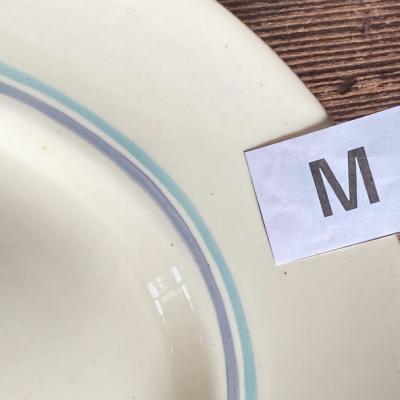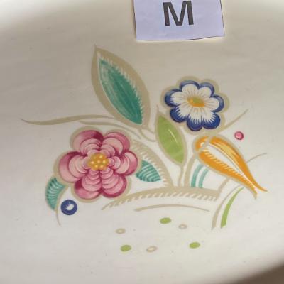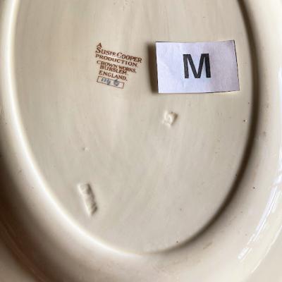 スージ―クーパー全盛期にクラウンワークス製陶器工場でデザインされた「Nosegay」シリーズ。香りの花束という意味でアールデコ調の花柄が特徴です【43-318-M】この当時(1932年)イギリス王室のメアリー王妃がスージーの食器を一目見て気に入り王室用の食器として購入したという素敵な逸話もあるようです。裏側に数字の12とアルファベットのような刻印あり。貫入はほとんどなく、製造時混入の小さな黒い点のみ確認できました。こちらはMサイズ。