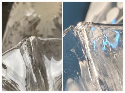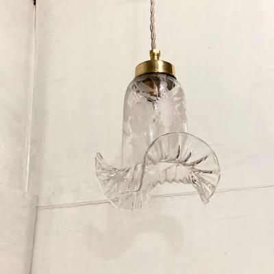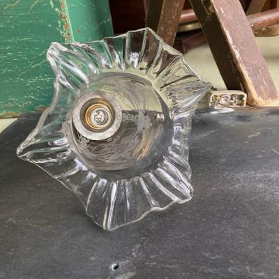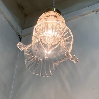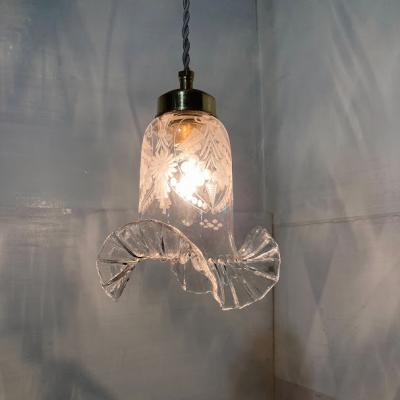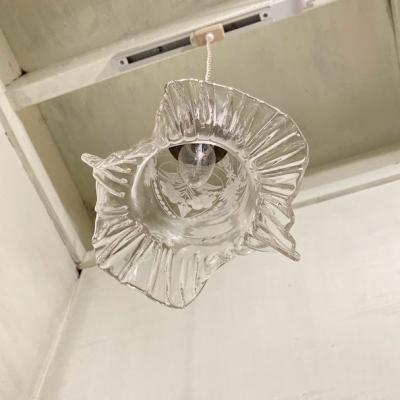 ダイナミックなフリルが印象的なエッチングガラスシェードが届きました【43-344】輸送時にできた1ミリほどのカケと小さなヒビがフリルの部分にあるため、お求めやすい価格にて販売しています。拡大した画像をご確認いただくと分かりますが、ヒダのデザインと一体化しているためあまり目立ちません。壁に反射する光は、幻想的な空間を浮かび上がらせます。