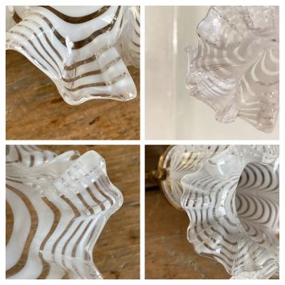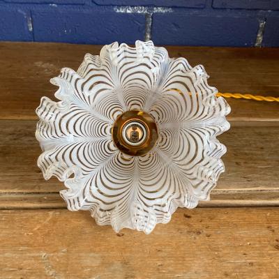白と透明の均整の取れたかきあげ模様が美しいガラスシェードが届きました【39-316】フランス製、推定1930年代。ダイナミックなフリルも重なり小さいながらも豪華な印象の照明です。フリルの折り曲げられた部分にヒビ割れのように見える箇所が見えますが、割れではなくガラスを折り曲げた際の凹みでした。