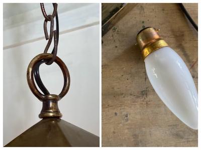 口金は海外仕様B22サイズを使用、コードは目立たない黒いコードを付属しています。付属のチェーンが約30㎝ほどありますので、お部屋に合わせて高さを簡単に調整できます。側面のガラスも内側で軽く折り曲げて、ちょこんと乗っているだけですので、吊り下げる際にはチェーンやガラスがしっかりと固定されていることを確認してくださね。