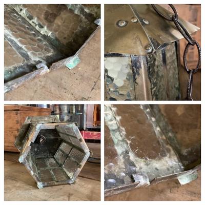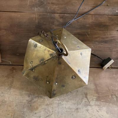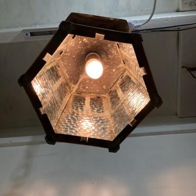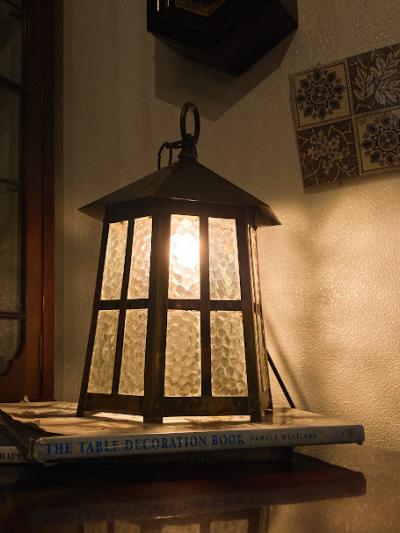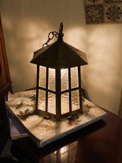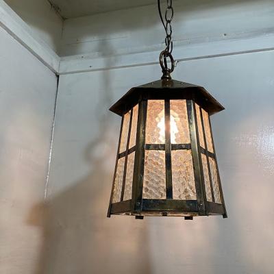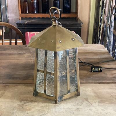 おうち型の真鍮製ペンダントライトが届きました【41-371】側面は凹凸のある古いガラスに包まれ、光が通るとキラキラと輝くようです。この照明は天井から吊るすばかりでなく、独特のデザインにより床や棚に置いて間接照明としても使えそう。全体的に見らる微細な傷や凹みは長い間大切に使われてきた証としてお楽しみください。このようなカラーレスガラスのタイプはあまりないので、いろいろな場所で活躍しそうですね。イギリス製、推定1940年代