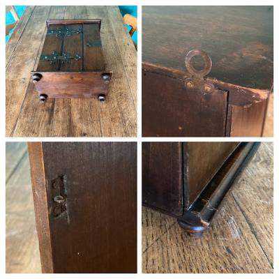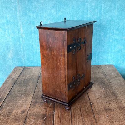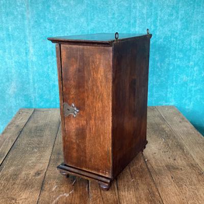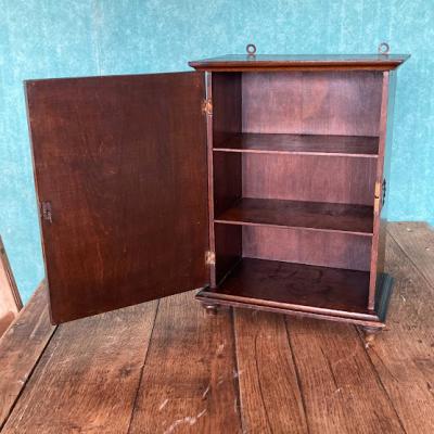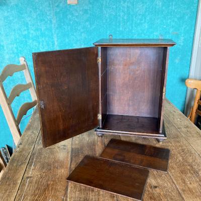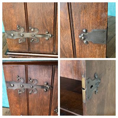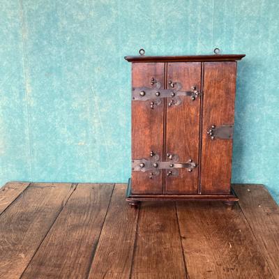 小さな薬棚が届きました【39-18】2段の棚はスライドして取り外しができるようになっています。背面には壁に掛けるための金具が2か所付属。向かって右側に鍵穴がありますが、専用の鍵は付属しません。飾りとしてお楽しみください。イギリスでは壁に掛けて薬棚として使用されていたそうですが、脚もしっかりとあります。鍵側の真横から見た時に扉と本体の間に隙間があるように見えます。こちらは長い年月を経てできたソリとなりますが、それだけ長い時を過ごしたという証です。お気に入りのコレクションを飾る特別なボックス、スパイスラック、ペット用お仏壇などさまざまな場所で活躍しそうですね。推定1920年代イギリス製、オーク材。