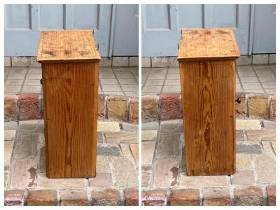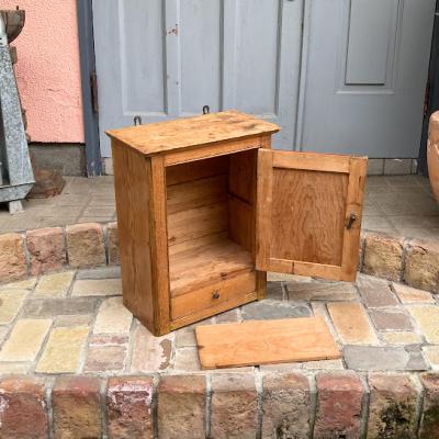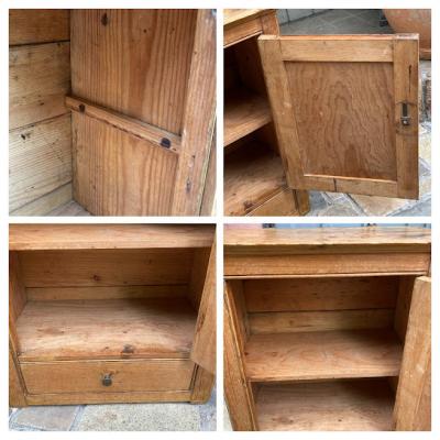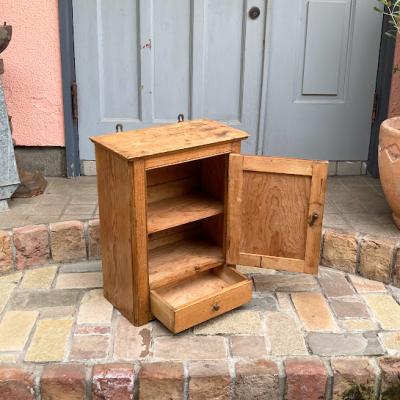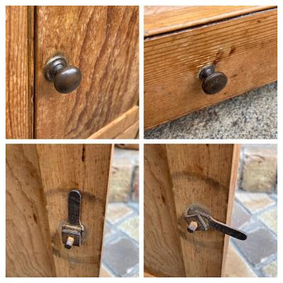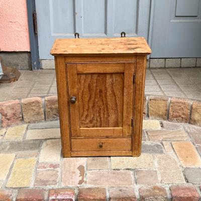 イギリスでは薬局の薬棚として使われていたキャビネットが届きました【43-237】推定1930年代、イギリス製。使い込まれたオールドパインの風合いは、落ち着いた空間を演出してくれますよ。匂いの感じ方に個人差はありますが、扉の内部に外国特有の甘い香りがほんのりと残っています。棚板は取り外し可能。扉を開ける時はつまみをクルっと回して開閉します。下には小さな引き出しもあるので、思っている以上に収納力があります。裏面には壁に掛けるための金具があるので、スペースを有効利用できますね。店舗什器としてもおすすめ。福岡市南区の店舗にてお渡しもできますのでお気軽にどうぞ!